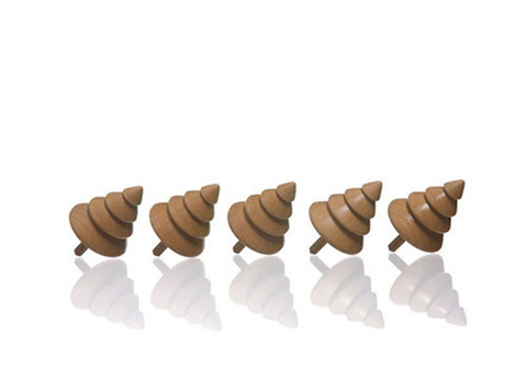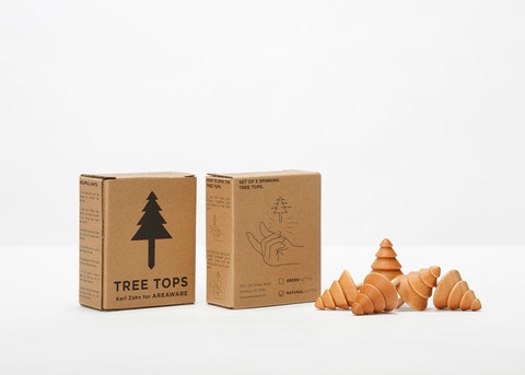 Karl Zahns 5er Set Tree Tops, zu deutsch Baumspitzen aber auch Baumkreisel, wurden aus dem Holz eines immergrünen Baumes gemacht und sehen auch so aus. Ein wunderbar ökobewusstes Spielzeug.