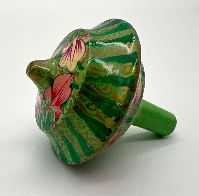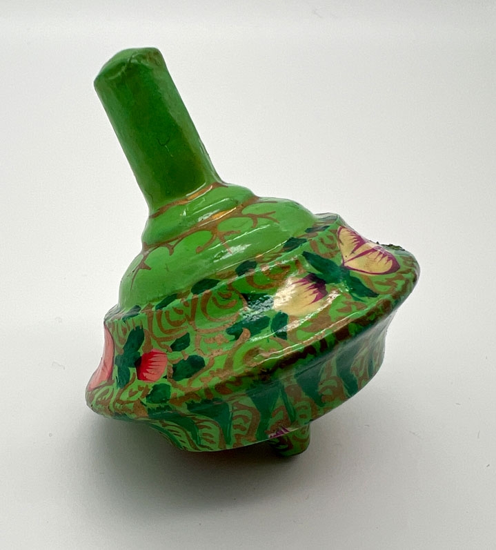 Der dekorative, bunte Kreisel "Kashmiri" ist ein echtes Kunstwerk aus Pappmaché. Handbemalt und lackiert, bringt er Farbe und Bewegung in Dein Zuhause. Ob als Dekorationsstück oder Spielzeug – dieser Kreisel mit einer Länge von 6 cm und einem Durchmesser von 4,5 cm, ist ein Unikat und zeugt von der meisterhaften Arbeit indischer Kunsthandwerker*innen unseres Handelspartners ASHA.