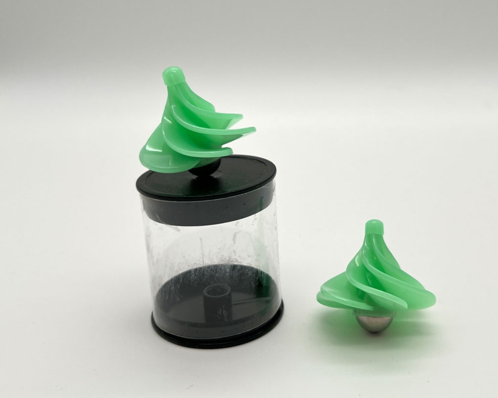 Der Kreisel ist magnetisch und sitzt fest in der Mulde, in der sich ein kleines Metallstück innen befindet.