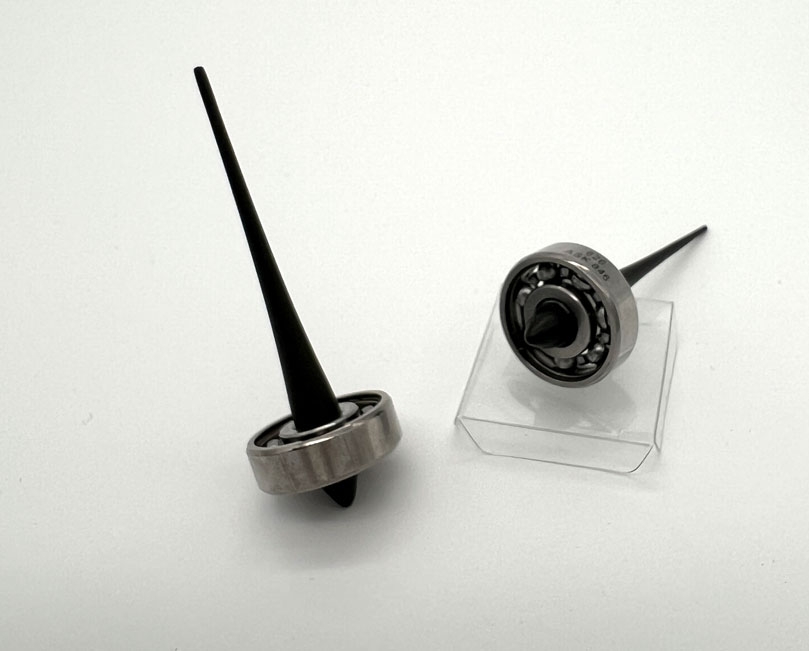 Ein Fingerkreisel aus einem Mini-Kugellagern mit filigranem Stiel aus Karbonfaser.
