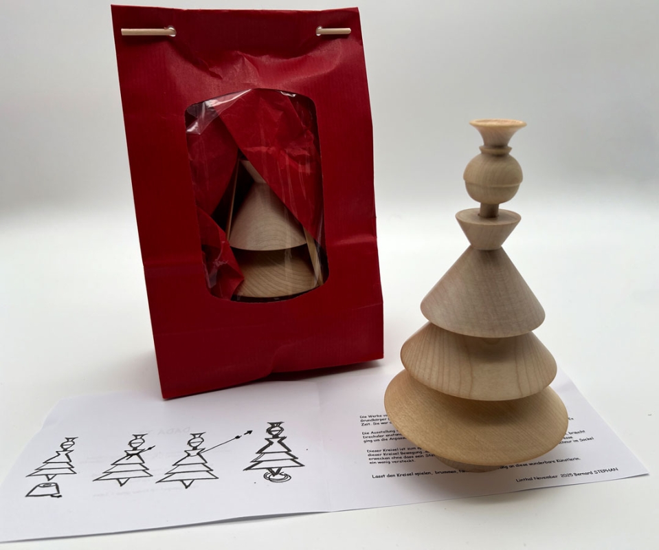 Dieser Kreisel ist zum spielen gedacht. Wie eine Marionette im Puppentheater auftreten soll, braucht dieser Kreisel Bewegung.aber er ist auch als Deko gestaltet. Als Objekt soll er das Interesse erwecken ohne dass sein Status als Kreisel erkennbar ist. Deshalb ist auch die Abziehschnur im Sockel ein wenig versteckt.