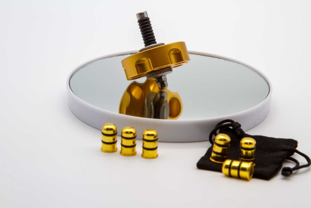 Dieser Kreisel ist ein Prototyp und wird in verschiedenen Versionen und Farben gefertigt. Das Design ist an das Magazin eines Trommelrevolvers angelehnt und wird mit 6 „Patronen“ geliefert.