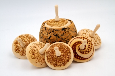 Dies ist die Ahornholz-Kreisel mit einem lasergravierten Mandala (verschiedene Versionen).