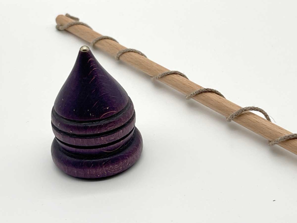 Der Peitschenfaden wird in den eingedrechselten Rillen um den Kreisel gelegt, um ihn aufzuziehen. Ist dies geglückt, gilt es den Kreisel mit gezielten Peitschenschlägen am rotieren zu halten. Es scheint ein sehr einfaches Spiel zu sein, dennoch braucht man etwas übung und Geschick dazu. In der Kreiselspitze ist ein Stahlnagel fest eingelassen.