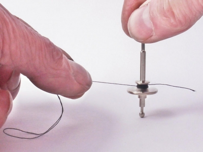 Griff in die Bohrung stecken, einen ca. 30 cm langen Garnfaden, mit dem Daumen der Haltehand, am Kreisel festklemmen und das freie Garnende in der Rille des Kreisels aufwickeln.